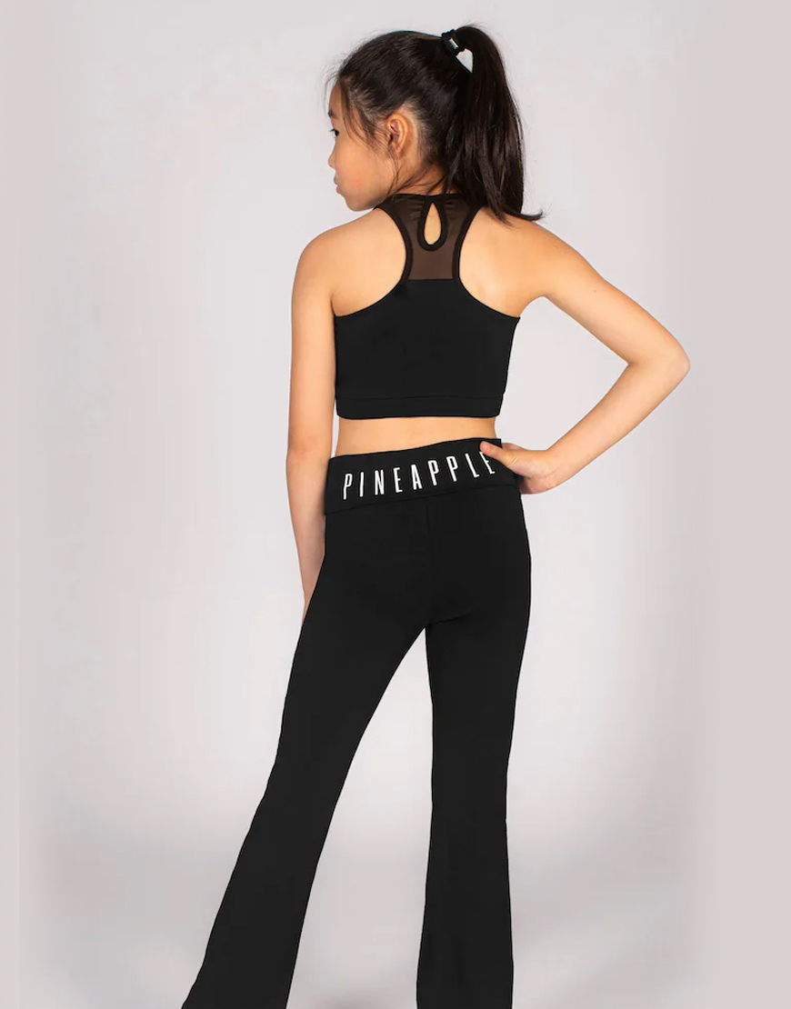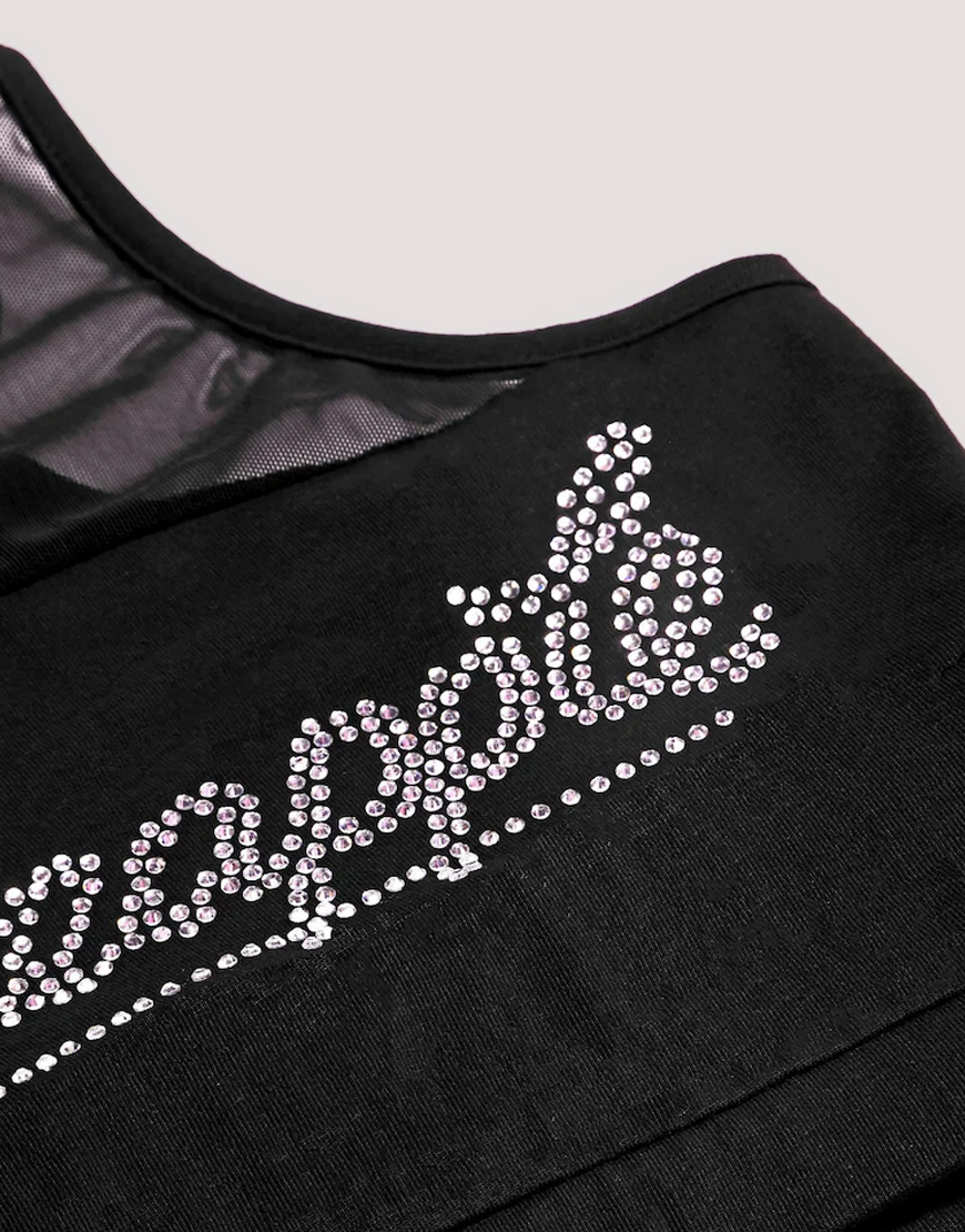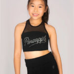 Add a touch of sparkle to your dance wardrobe with this black long-sleeve crop top featuring soft and stretchy mesh sleeves. The cropped length makes it cool to wear and easy to pair back with your favourite high-rise bottoms, whilst the elasticated band holds you in comfortably and securely so you can move with confidence and ease. This crop top features a round mesh neckline, complete with mesh long-sleeves and shoulders, plus a dazzling diamanté ‘Pineapple’ logo print across the chest.